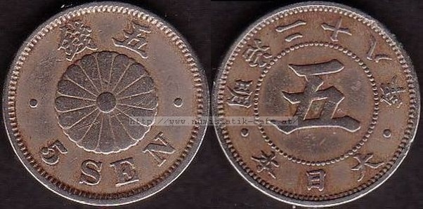 | Bildbeschreibung: | 5 Sen 1895 Chrysantheme Material: Kupfer 750 / Nickel 250 Durchmesser: 20,60mm Gewicht: 4,67g Randschrift: Keine / glatt Auflage: 1,030,000 Kat.-Nr.: Schön: ? KM: 20? JNDA: 01-36 |