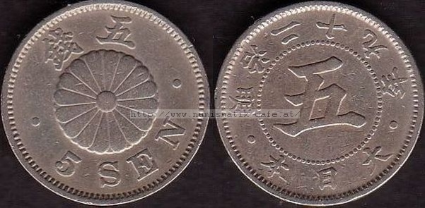 | Bildbeschreibung: | 5 Sen 1896 Chrysantheme Material: Kupfer 750 / Nickel 250 Durchmesser: 20,60mm Gewicht: 4,67g Randschrift: Keine / glatt Auflage: 5,119,988 Kat.-Nr.: Schön: ? KM: 20? JNDA: 01-36 |