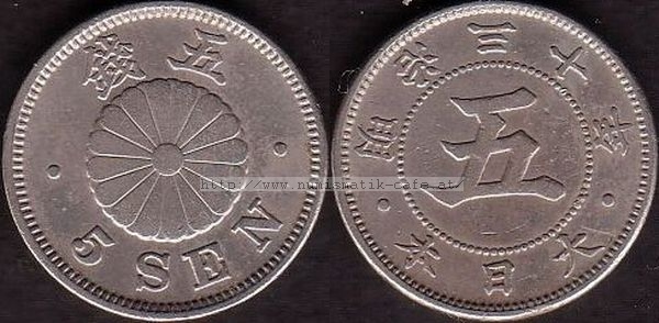 | Bildbeschreibung: | 5 Sen 1897 Chrysantheme Material: Kupfer 750 / Nickel 250 Durchmesser: 20,60mm Gewicht: 4,67g Randschrift: Keine / glatt Auflage: 7,857,669 Kat.-Nr.: Schön: ? KM: 20? JNDA: 01-36 |