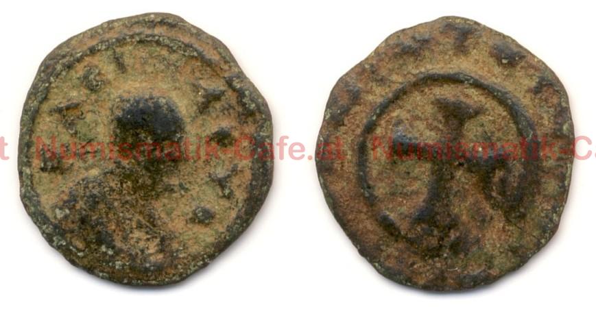 | Bildbeschreibung: | anonymus (die frühesten mit unverwilderter Schrift eventuell schon ab Ezanas) ca. AD 330 - 425 griechisches BASILEUS, getatztes Kreuz Cu 0,65 g Durchmesser: ca. 12,4 - 12,9 mm Dicke: 1,1 mm MH # 52 Bild mit freundlicher Genehmigung von Münz-Goofy! |