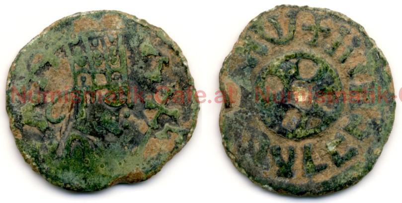 | Bildbeschreibung: | anonymus (eventuell Nezana oder/und Ousana) ca. AD 450 - 500 Cu 1,10 g (ein analysiertes Stück hatte: Cu 89%, Zn 6,5%, Sn 2%) ca. 15,2 mm H # MH #76 Die Umschrift TOUTO ARESETE ChORA auf dieser Münze läuft von rechts nach links, im Bild bei 11 Uhr beginnend. Das zweite O ist auf dem angrenzenden Balken des A plaziert. Bild mit freundlicher Genehmigung von Münz-Goofy! |