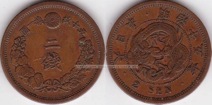 | Bildbeschreibung: | 2 Sen 1882 Material: Kupfer 980 /Zinn 10 / Zink 10 Durchmesser: 31,81mm Gewicht: 14,26g Randschrift: Keine / glatt Auflage: 43,572,187 Kat.-Nr.: Schön: ? KM: ? JNDA: 01-45 |