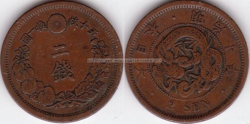 | Bildbeschreibung: | 2 Sen 1877 Typ 2 Material: Kupfer 980 /Zinn 10 / Zink 10 Durchmesser: 31,81mm Gewicht: 14,26g Randschrift: Keine / glatt Auflage: 43,290,398 Kat.-Nr.: Schön: ? KM: ? JNDA: 01-45 Drachenschuppen V-förmig |