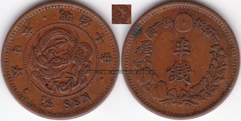 | Bildbeschreibung: | 1/2 Sen 1874 Typ 2 Material: Kupfer 980 /Zinn 10 / Zink 10 Durchmesser: 22,20mm Gewicht: 3,56g Randschrift: Keine / glatt Auflage: zusammen mit Jahrgang 1873 und 1874 Typ1 = 16,804,440 Kat.-Nr.: Schön: ? KM: ? Yeoman:16 JNDA: 01-53 dünner Drachen (ersichtlich an der hervorgehobenen Bildstelle, im Bild des Typ 1 ersichtlich an der Position des Pfeil) |