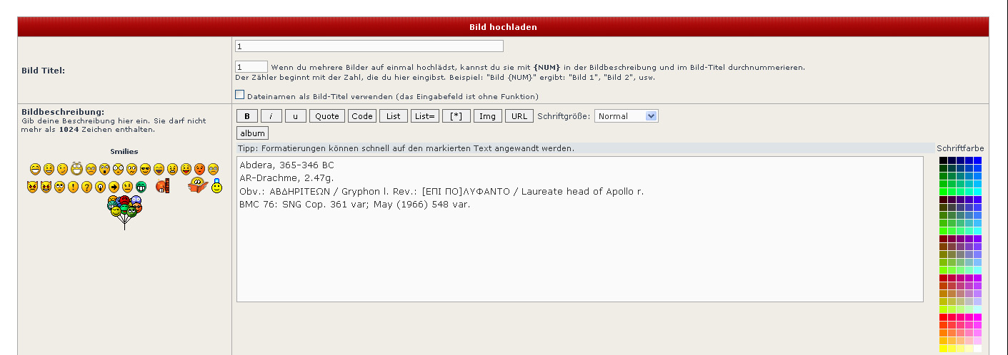 ich versteh' deine Frage nicht ganz. Griechische Zeichen und Ziffern lassen sich doch einfach in den Textabschnitt (Bildbeschreibung) der jeweiligen Galeriemünze kopieren! Probier's mal!