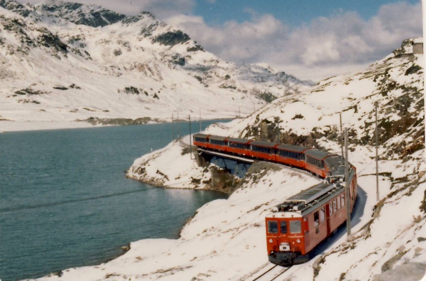 Unten ein Bild eines modernen Zuges der Rhätischen Bahn an ungefähr gleicher Stelle, wobei der See gut zu erkennen ist.