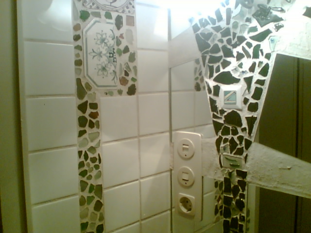 Im WC bei meiner Tochter habe ich einmal etwas Ähnliches mit im Urlaub am Meer gesammelten Glasscherben gemacht. Die linke Seite gefällt mir, bei der rechten stimmen die Linien auch nicht. Da merkt man, dass ich nicht genug Zeit hatte und die Wand fertig werden sollte (bevor meine Tochter das Bad nicht mehr benötigt, weil sie studieren geht :) ).