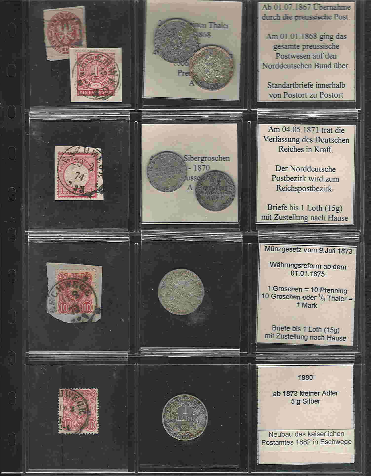 Mir ging es darum, den Wert der Währung zu dokumentieren und in der Zeit vor der Markwährung waren die Groschen nur Scheidemünzen (und entsprechend untergewichtig). Besser wäre es gewesen, dies mit Thalern und 3-MarkStücken zu dokumentieren, aber da machten die Finanzen nicht mit. So behelfe ich mir mit der Aussage, das man für eine Mark oder 1/3 Thaler (wurden nicht ausgemünzt, daher zwei 1/6 Talerstücke) damals 10 Briefe verschicken konnte, Anfang der 90iger Jahre noch genau 1.