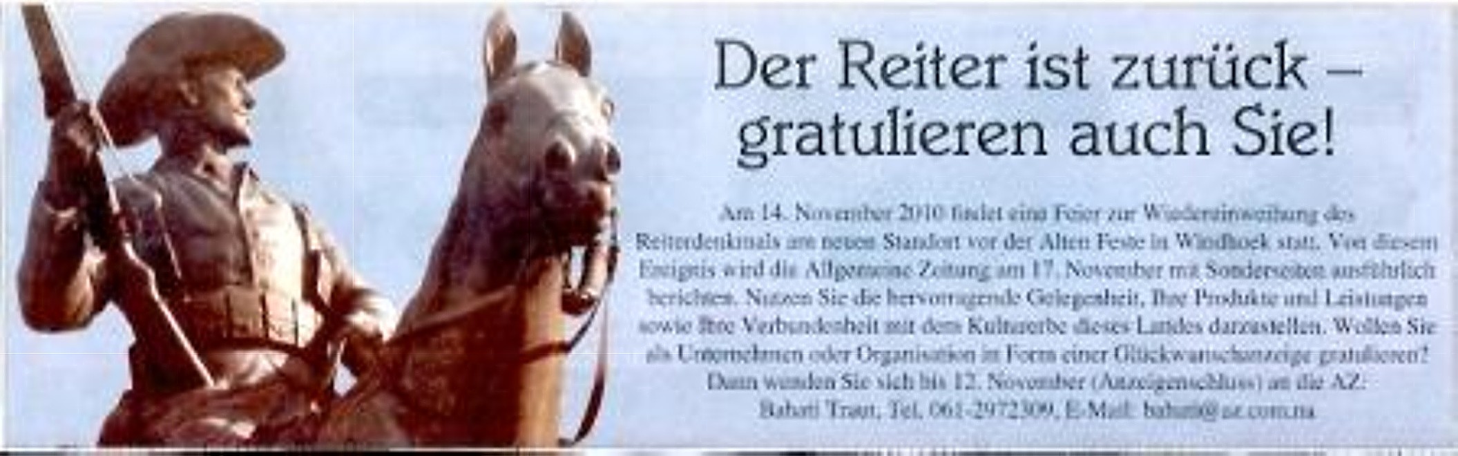Guten Morgen, ich komme erst heute dazu, von der Feier zur Neuweihe unseres Reiters und dem gleichzeitigen Gefallenengedenken am 17.7. in Windhuk zu berichten. Etwa 100 Personen hatten sich eingefunden, die Polizei hatte pünktlich die Leutwein (Mugabe)-Straße abgesperrt. Traditionsverband war der Ausrichter, Kriegsgräberfürsorge, Volkstanzkreis, Soldatenkameradschaft, MOTH und weitere Vereine nahmen teil. Es hatte nachts geregnet. Als die Fahnen in der frischen Morgenluft flatterten und 2x die wirklich schöne Namibischen Nationalhymne erklang, war das ein ergreifender Moment und manche Augen wurden feucht. Weder von der Regierung, noch vom sogen. Deutschen Kulturrat noch von der Dt. Botschaft waren Vertreter erschienen. Die Reden waren vom Versöhnungsgedanken geprägt, der Erinnerung an alle Gefallenen und Ermordeten aller Hautfarben in allen militärischen Konflikten, die SWA betroffen haben. Ich hatte die Ehre, die Kaiserl. Kriegervereinsfahne von 1896 zu tragen. Sie war die einzige Fahne, die bei der Einweihung des Reiters 1912 bereits dabei war. Eine alte Lüderitzbuchterin (91 Jahre!), die die 850 km Anreise nicht gescheut hatte, stand minutenlang neben mir, hielt meine Hand und einen Zipfel der Fahne. Sie meinte, daß Gott ihr vergönnt hat, das noch zu erleben, sei ihr schönstes Geschenk. Danach fand, wie jedes Jahr, am Cross of Sacrifice die Gedenkfeier von MOTH (das ist der Südafrikanische Stahlhelm) statt, an der ebenfalls unser Traditionsverband und die anderen Vereine mit Kränzen teilnahmen. Hier waren auch der Britische Hochkommissar, Deutscher Botschafter und Bundeswehr anwesend. Auf die mehrfache Frage an den Botschafter, warum er deutsche Gefallene am Reiter nicht ehrt, kam die Antwort: DAS IST NICHT DIE TRADITION DER brd! - und rauschte wütend ab! Daß er an den Gräbern Südafrikanischer Soldaten stand, die im Ovambo-Feldzug der Südafrikaner 1916 gefallen sind, wo auch der heute hochgeachtete Ovambo-König Mandume Ndemufayo umkam, kratzt ihn nicht. Ich denke, wir brauchen das hier nicht weiter zu kommentieren, denn wir sind kein politisches Forum, sondern möchten vor allem unserem Hobby frönen. Der Mann tut ja nur, was ihm die gewählten Volkstreter befehlen.