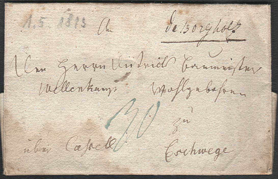 Eigentlich müsste der Ort irgendwo im ehemaligen Königreich Westphalen liegen, denn das Porto von 30 Centime (ungefähr 20 Heller oder 1 albus 8 Heller) deutet auf einen Inlandsbrief hin.