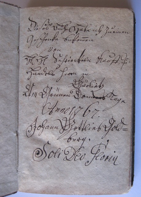 "Dieses Büchel habe ich zu einem Geschenke bekommen von H H Schrieckeln Kauf... Handels Herrn in Görlitz am Grünen Donnerstage Anno 1767 Johann Gottlieb Goldberg Soli Deo Gloria"