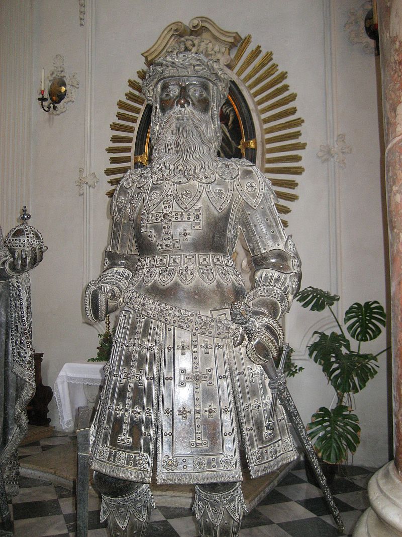 Dein Bild stammt ganz offenbar aus der Hofkirche Innsbruck, wo eine ganze Reihe von Bronzestatuen (insgesamt wohl 28 von ursprünglich viel mehr geplanten) im - leeren - Grabmal von Maximilian I (1459 - 1519) aufgestellt sind. Maxl ist ja schließlich doch in Wiener Neustadt beerdigt worden. Das hat aber mit dem Rätsel wohl nichts zu tun. Das Mausuleum in Innsbruck ist sicher eine Reise wert.