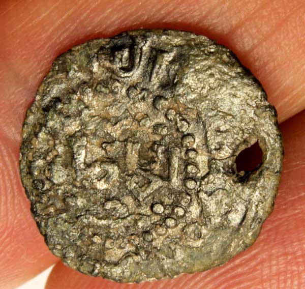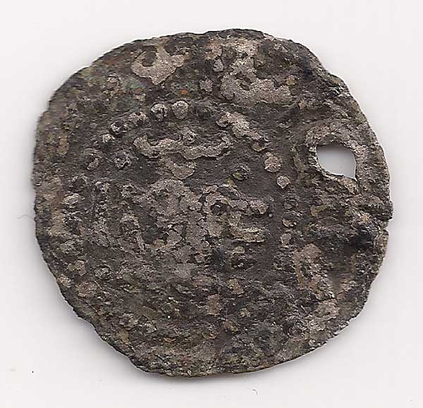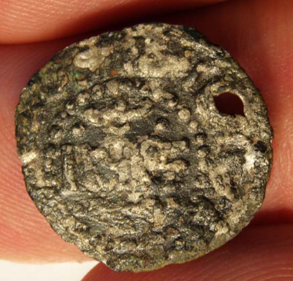 Es sieht nach einer arabischen Münze aus, dass die ein Loch hatte (und als Bauchtanzmünze Verwendung fand) ist nicht verwunderlich. Was mich stört ist allerdings der regelmäßige Kreis aus Perlen um das Münzbild, das kenne ich von arabischen Münzen nicht (was aber nichts heißen muss). Und bei europäischen Münzen wären außerhalb des Kreises keine Zeichen mehr.