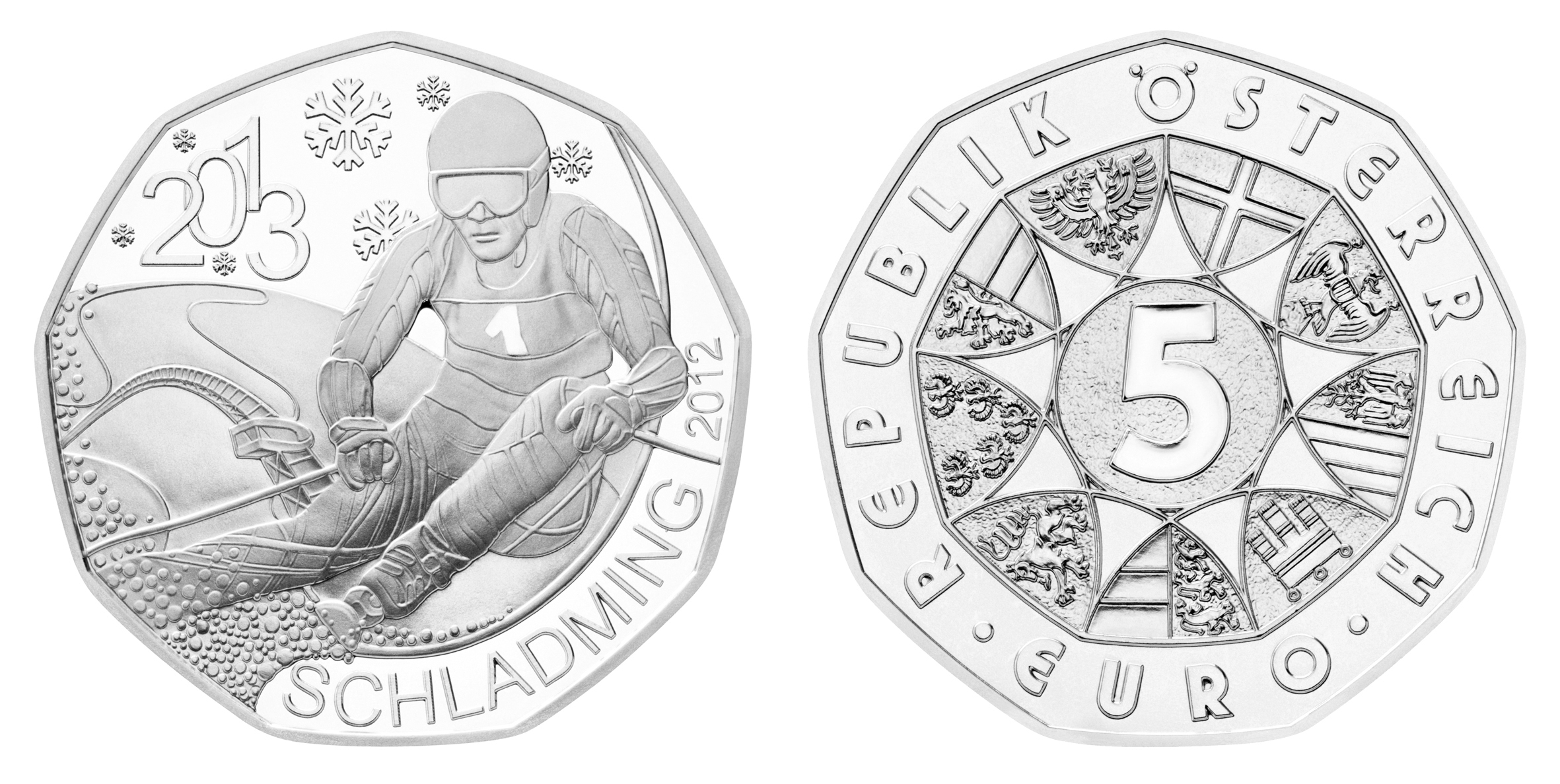 Die 5-Euro-Silbermünze „Schladming 2013“ ist in der Qualität „Handgehoben“ ab 24. Oktober 2012 in Banken, Sparkassen, im Münzhandel, im Onlineshop unter