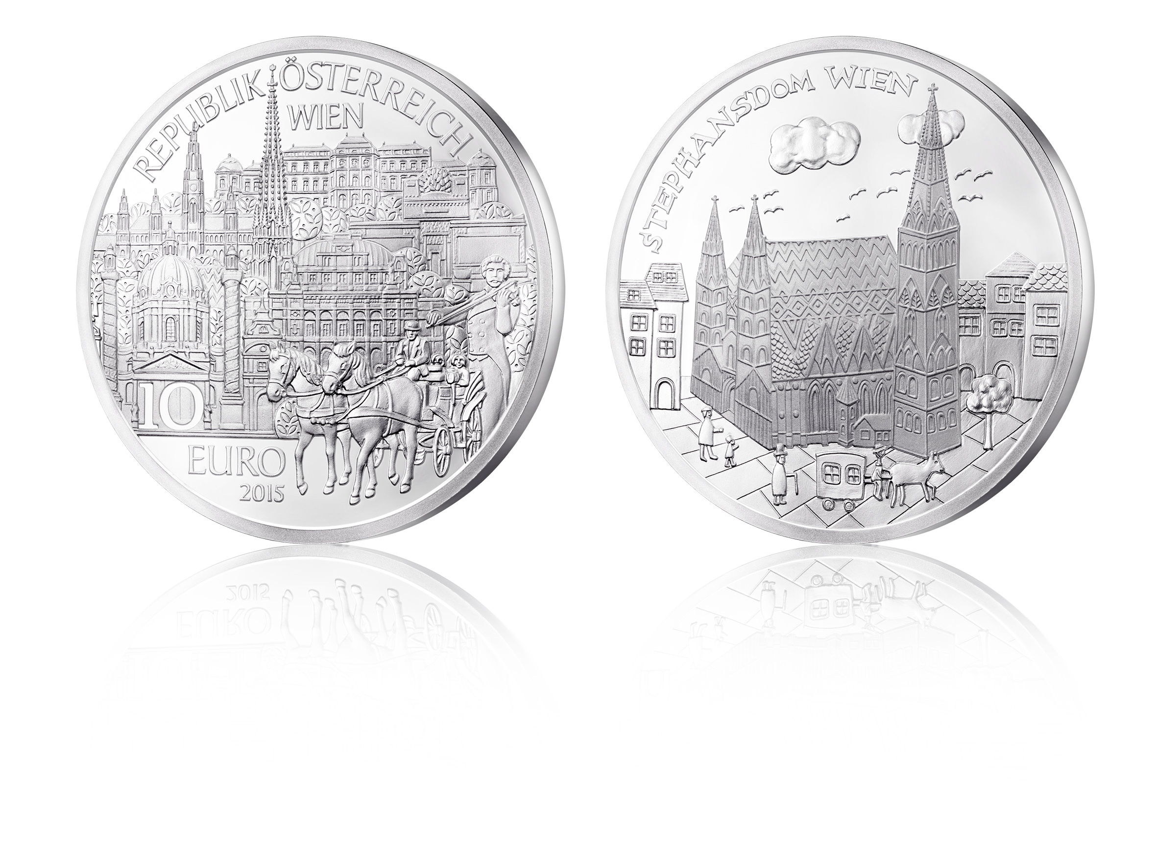 Auf der anderen Seite ist der adaptierte Siegerentwurf des Schülerwettbewerbes zu sehen. Der Wiener Stephansdom bildet das Hauptmotiv. Links und rechts vom Dom ist eine Häusergruppe zu sehen. Stilisiert dargestellte Vögel und Wolken füllen die freie Fläche im oberen Teil der Münze. Figuren, ein Fiakergespann und ein Baum zieren den unteren Rand. Der Text „STEPHANSDOM WIEN“ ist bogenförmig in die obere Münzhälfte gesetzt.