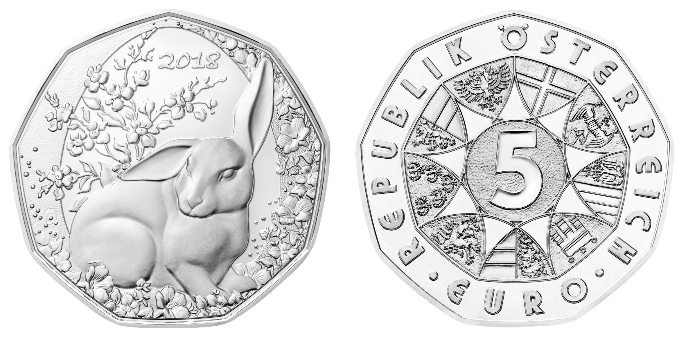 Wie bei den vorhergegangenen österreichischen 5-Euro-Münzen sind auf der Wertseite der neuneckigen Münze die neun Landeswappen im Kreis angeordnet. Die andere Seite bezieht sich gleich auf mehrere wunderschöne Designs der Wiener Porzellanmanufaktur. Ein Vasendekor diente als Vorlage für die Vergissmeinnicht im Hintergrund. Unten und rechts umrahmt das bekannte Maria-Theresia-Ornament das Hauptmotiv, das nach Michael Powolnys Hasen (zirka 1930) gestaltet ist. – Der Hase hat eines seiner langen Ohren in die Horizontale gedreht; in der Richtung, in die er horcht, hofft er etwas zu erlauschen.