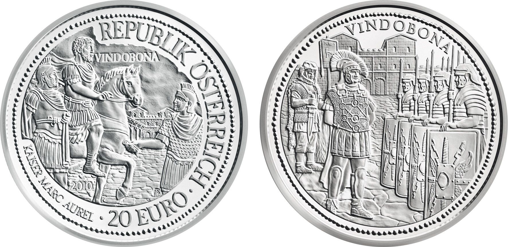 Die neue 20-Euro-Silbermünze zeigt uns auf der einen Seite den großen römischen Kaiser Marc Aurel zu Pferd im Legionslager von Vindobona. Neben dem Kaiser ist ein Soldat seiner Garde zu sehen. Ein Offizier überreicht dem Kaiser eine schriftliche Botschaft. Im Hintergrund ist ein Haupttor des Lagers mit den zwei Verteidigungstürmen zu sehen. Nachempfunden wurde die Darstellung einer Reliefszene aus den Markomannenkriegen Marc Aurels.