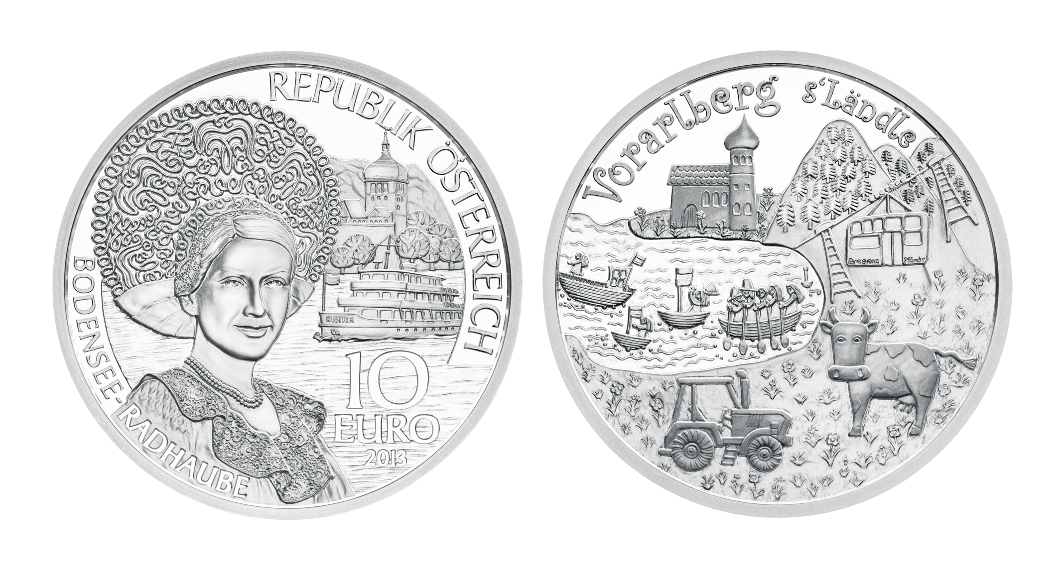 Mit dem Geldstück „Vorarlberg“ erscheint nach der „Steiermark-“, der „Kärnten-“ und der „Niederösterreich-Münze“ am 16. Oktober die vierte Ausgabe in der Bundesländer-Serie. Aufgrund der großen Beliebtheit sind alle bisherigen Stücke neben den hochwertigen Silberausgaben („Handgehoben“ und „Polierte Platte/Proof“) auch als Normalprägung zum aus Kupfer – 10 Euro gegen 10 Euro - erhältlich. Selbstverständlich sind alle Vorarlberg-Münzen Zahlungsmittel in ganz Österreich.