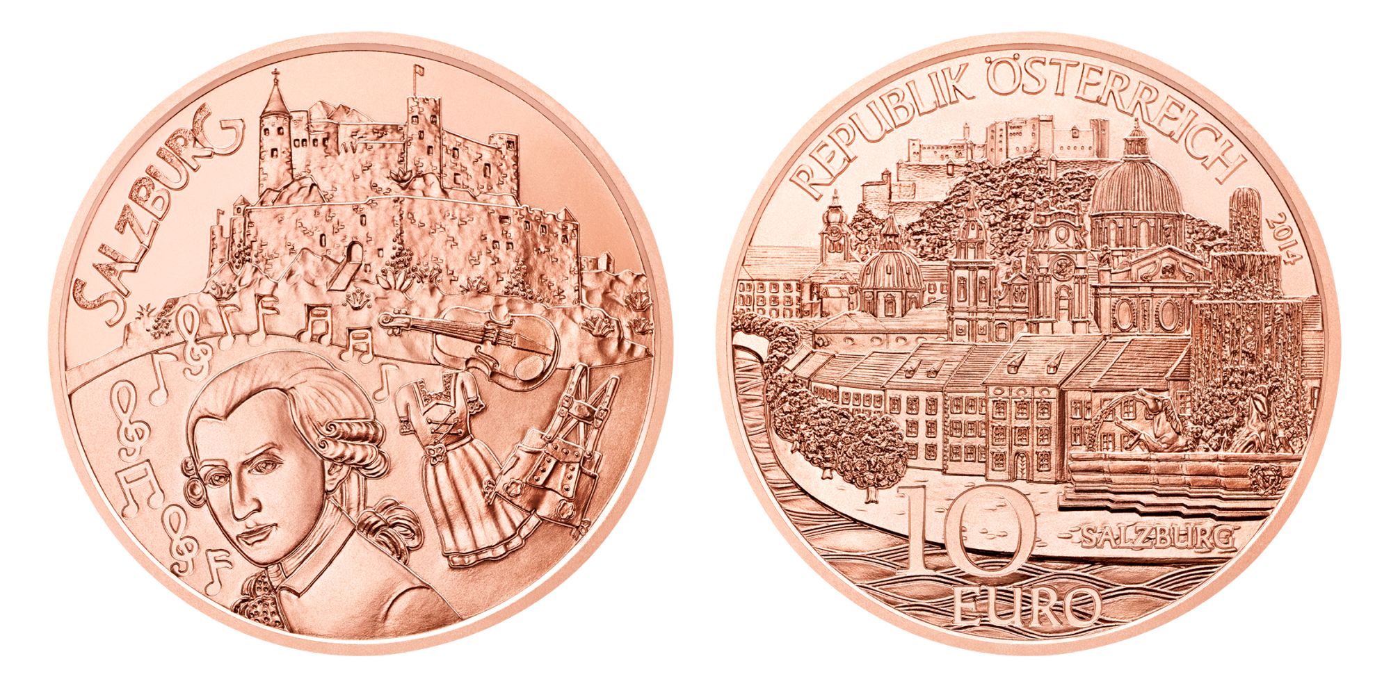 Aussehen: Die Wertseite zeigt eine idealisierte Ansicht der Salzburger Altstadt. Am rechten Münzrand, in den Vordergrund gerückt ist der Residenzbrunnen abgebildet. Links davon und nach hinten verlaufend folgen die Kollegienkirche, der Salzburger Dom und das Kloster Nonnberg. Den Gebäuden vorgelagert ist eine vereinfachte Häuserzeile, eine Baumgruppe sowie in stilisierter Form die Salzach. Mittig im Hintergrund ist die Festung Hohensalzburg dargestellt. Darüber, dem Rund der Münze entlang sind der Text „Republik Österreich“ und die Jahreszahl „2014“ platziert. Auf den Silberprägungen weist links davon ein Symbol die Münze als Teil des Europäischen Silberprogramms aus, auf den Kupferstücken fehlt dieses Zeichen. In der unteren Münzhälfte sind der Nennwert „10 Euro“ und der Stadtname „Salzburg“ waagrecht angeordnet.