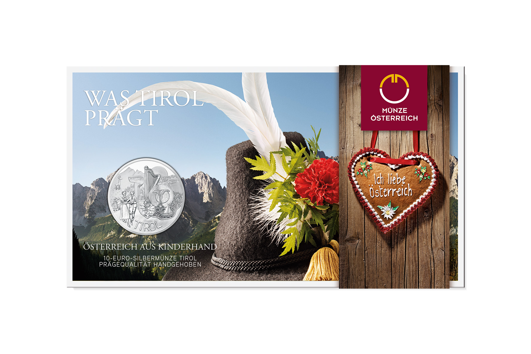Das Münzbild auf der anderen Seite, basierend auf dem Siegerentwurf des Schulwettbewerbs, zeigt eine Vielzahl typisch Tiroler Motive. Den Hintergrund bildet eine Berglandschaft im Sonnenaufgang mit Hochwald, Alm und Almhütte. Davor gesetzt sind links eine Gämse auf einem Felsen und rechts davon die Bergisel-Schisprungschanze. Im Hintergrund ist ein Nadelwald zu erkennen. Mittig ist eine Tiroler Harfe platziert, darunter das Tiroler Wappen. Beide sind zum Teil von einem Tiroler Trachtenhut mit Feder- und Blumenschmuck überdeckt. Ein kleiner Teich mit Segelboot schaut unter dem Hut und dem Wappen hervor. Links im Vordergrund sind ein Tanzpaar in Tiroler Tracht und, links dahinter, tanzende Kinder dargestellt.