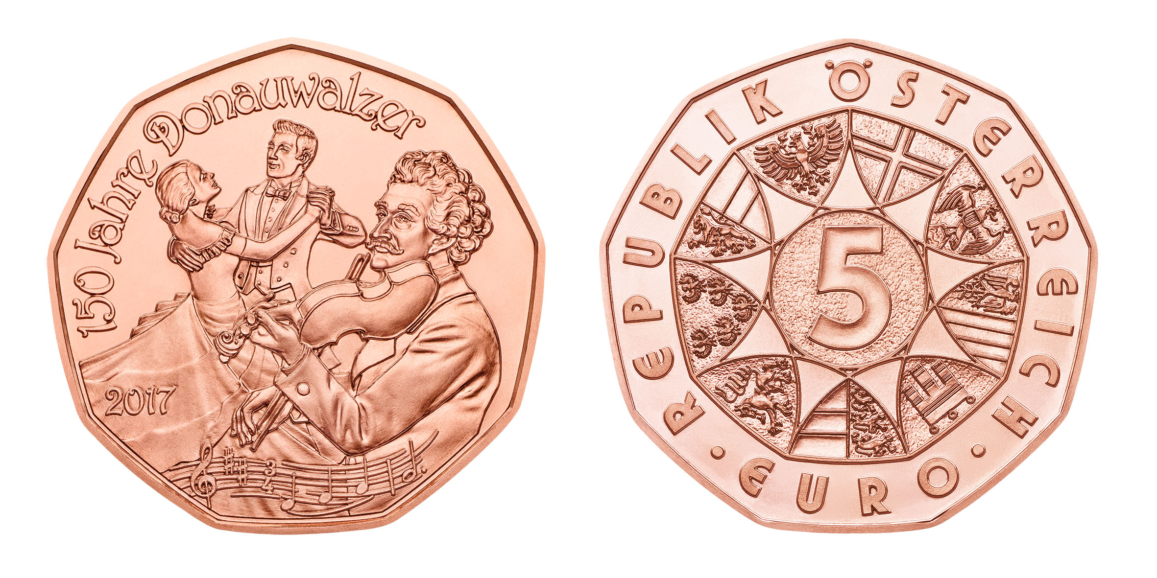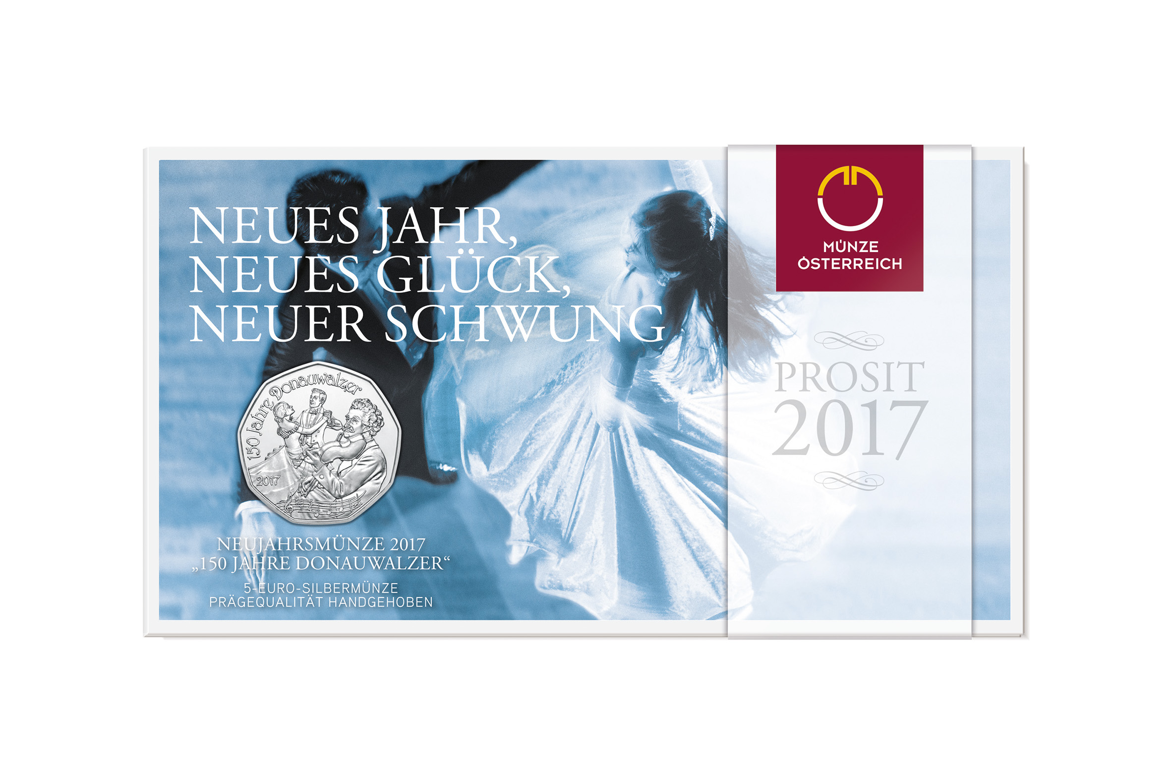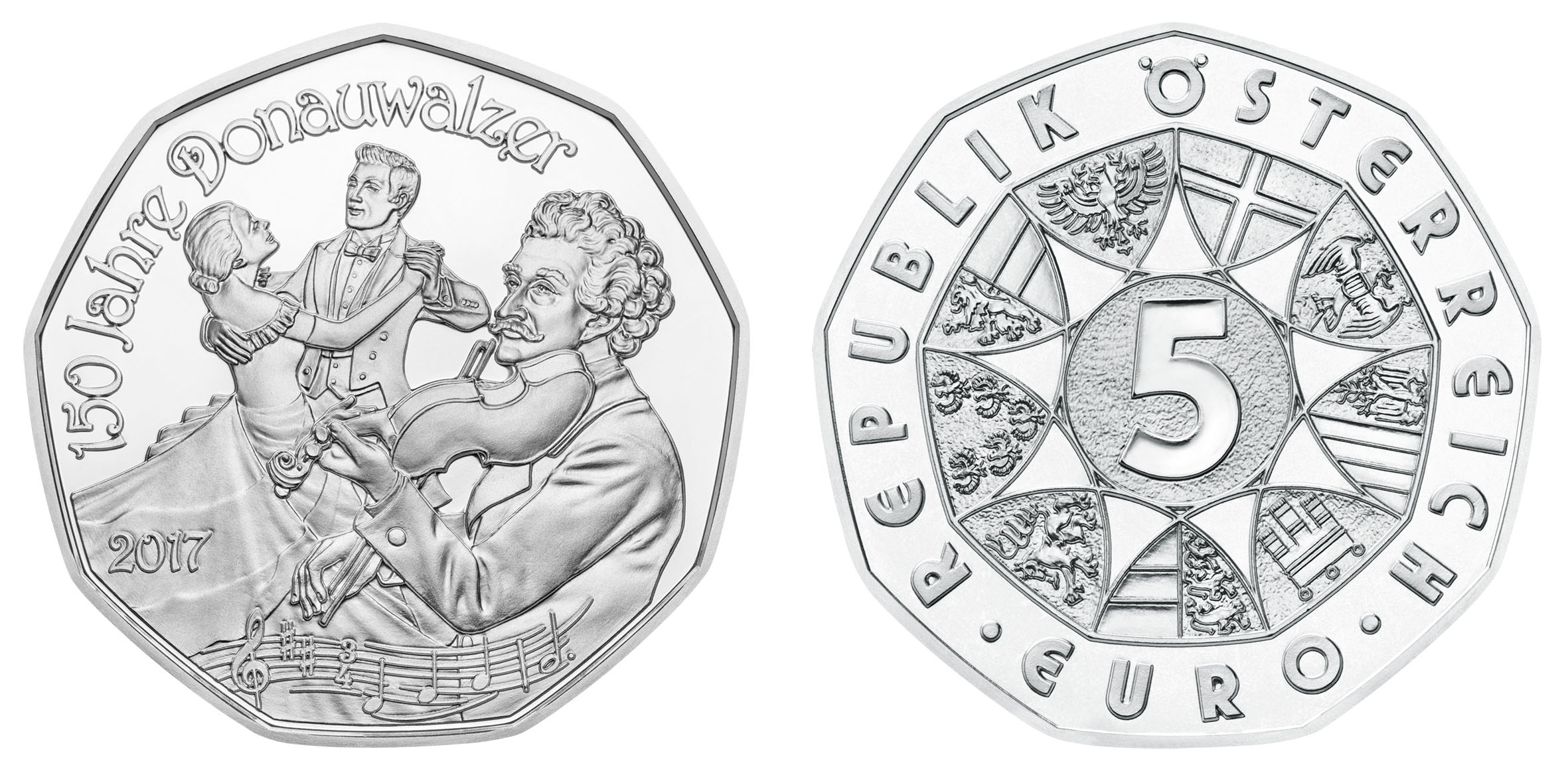 Die 5-Euro-Münze „150 Jahre Donauwalzer“ gibt es aus Silber in der Qualität „Handgehoben“ in einer zweisprachigen Verpackung mit „Prosit 2017“-Banderole (Auflage: 50.000 Stück). 200.000 Stück aus Kupfer sind wieder in normaler Prägequalität zum Nennwert erhältlich.