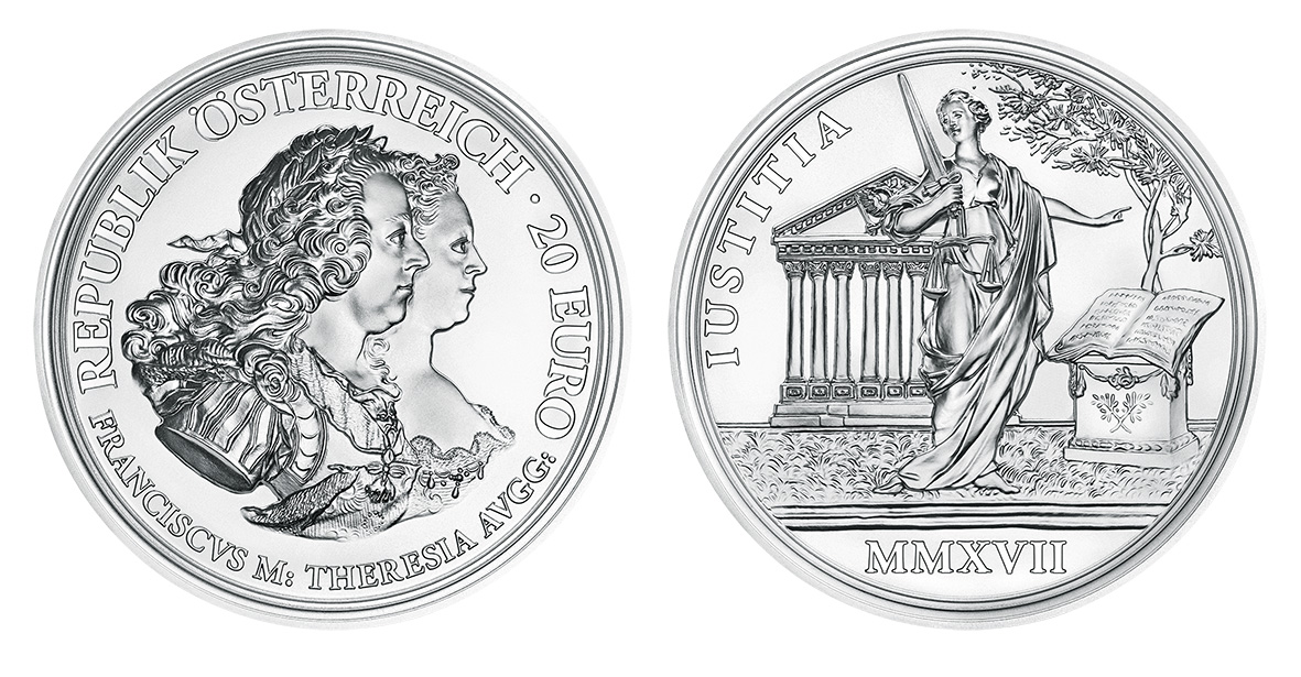 Maria Theresia und Franz I.: Dass sie auf der Münze einträchtig nebeneinander zu sehen sind, war mehr als nur schöner Schein. Tatsächlich hatte sich das Mädchen Maria Theresia ihn als Ehemann eingebildet; es war eine Liebesheirat. Anfänglich wünschte sie, Franz möge mit ihr gemeinsam regieren und von allen bewundert werden. Schließlich musste sie einsehen, dass er der Aufgabe nicht gewachsen war. So schob sie ihn behutsam zur Seite, hart weniger gegen ihn als gegen sich selbst; ihre tiefe Zuneigung zu ihm blieb indes bestehen. Fortan wollte sie die Macht mit niemandem mehr teilen; und sie teilte sich selbst auf drei Rollen auf: liebende Gattin, fürsorgliche Mutter und arbeitssame Alleinherrscherin. Weder Katharina die Große in Russland noch Elisabeth I. in England wirkten auf diese Weise nach allen Seiten hin. Das macht Maria Theresia zu einer einzigartigen Herrscherin nicht nur ihrer Zeit; und dadurch ähnelt sie in Manchem einer Frau von heute. 20-Euro-Silbermünze „Gerechtigkeit und Härte“