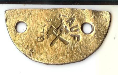 Das erste Stück ist eine halbrunde Marke mit zwei Tragelöchern von 4 mm Durchmesser. Abmessungen 43 x 23 mm, Gewicht 8,23 g; Messing. Inschrift: GLüCK - AUF