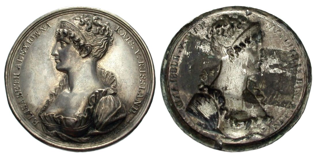 Elisabeth Alexeiowna, l’impératrice de Russie. Einseitiges versilbertes Messing-Klischee o. J. (von Detler). Brustbild der Gemahlin des Zaren Aleksandr I., Elisabeth Alexeiowna, l. 55 mm. Br. 2288. Trésor - . Slg. Jul. 3073 (vergoldet). Feine Kratzer. Sehr schön-Vorzüglich / SUP