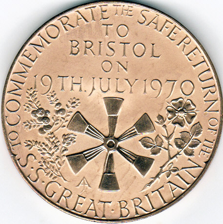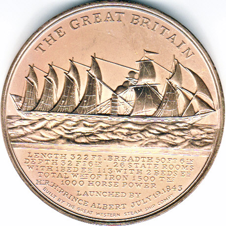 - Medaille von A.J. (?), 39 mm, Bronze (?), vergoldet, Eimer --. Die Vorderseite zeigt den Dampfer nach dem Vorbild einer der Stapellauf-Medaillen (leider weiß ich nicht, welche). Die Rückseite bezieht sich auf die Rückkehr des Dampfers nach Bristol am 19.7.1970, also exakt 127 Jahre nach dem Stapellauf. Dargestellt ist Brunels innovation, die Antriebsschraube, flankiert von einer Rose (für England) und einer Heidelbeere (?) (für die Falklands). Die Medaille wurde von der Royal Mint geprägt im Auftrag der Fa. Overton, Farrell & Sons (ein Medaillenvertrieb in London). In Silber betrug die Auflage 5.000 Stück. Möglicherweise wurden die Medaillen auch an Personen ausgegeben, die sich um die Rückkehr des Schiffswracks nach England engagiert hatten. - Jedenfalls ist das Schiff heute perfekt restauriert als Attraktion in Bristol zu besichtigen.