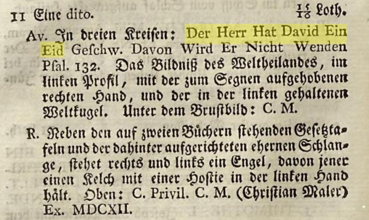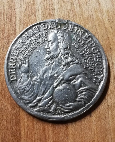 Diese Medaille besitze ich schon einige Zeit. Bin bis jetzt leider noch nicht draufgekommen wer der Medailleur ist und zu welchen Zweck/Anlass solche Medaillen gemacht wurden. Es gibt eine Henkelspur aber durch diesen Bruch sieht man leider einen Teil einer Aufschrift nicht mehr. Es dürfte sich um Salvator Mundi handeln und darüber der Psalm 132 niedergeschrieben. Auf der Rückseite 2 Engel mit der Steintafel und den 10 Geboten? Maße: 33mm, Gewicht: 10,33gr. Material Silber.