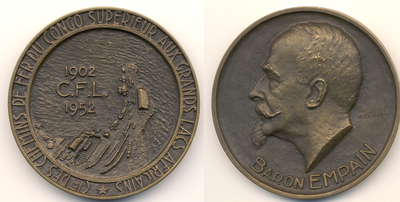 Treibende Kraft hinter den Aktivitäten der kongolesischen CFL war Baron Édouard Louis Joseph Empain (1859 – 1929), der von Léopold II. 1907 geadelt wurde und auf dem Rv dargestellt ist. Er war ein belgischer Ingenieur, Industrieller, Banker, Amateur-Ägyptologe und nicht zuletzt Präsident der Eisenbahngesellschaft C.F.L. Außerdem entwickelte er mehrere Eisenbahnstrecken in Frankreich, darunter die Pariser Metro. Später errichtete er elektrische Eisenbahnen in ganz Europa, sowie in Afrika und China. Als Leiter der belgischen Waffenproduktion während des Ersten Weltkrieges wurde ihm der Rang eines Generals verliehen