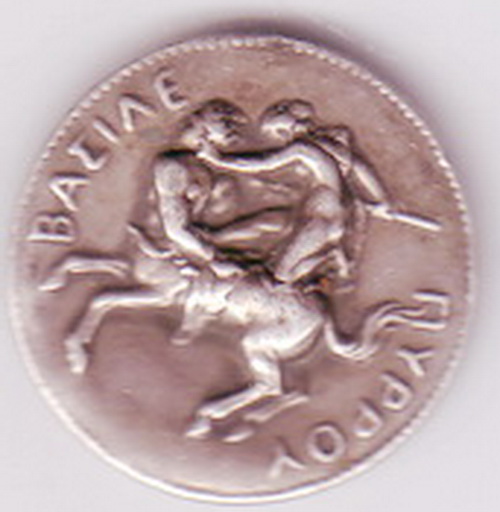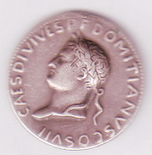 Ich halte das Teil für ein Konglomerat - ein Caesaren-Portait, für das möglicherweise Napoleon Pate gestanden hat, eine lateinische DIVUS-Legende auf Domitian (der i.ü. der "damnatio memoriae" verfiel), im Revers ein lustiges Bild nach einer Vorlage von ca. 1812 "Kentaur wird von einer Nymphe geneckt" (nicht erstochen! ) und eine etwas falsche griechische Umschrift. Einen inneren Zusammenhang der Elemente kann ich nicht erkennen.