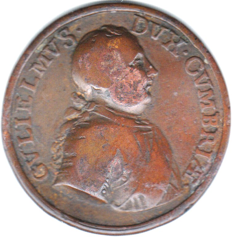 Das heute vorgestellte Stück kann als kleine populäre Medaille oder als Jeton angesprochen werden. Es zeigt Wilhelm Herzog von Cumberland (1721-1765) und auf der Rückseite einen schottischen Highländer in demütiger Haltung vor dem englischen Löwen. Die Jahreszahl 1746 verrät den Hintergrund, die Schlacht von Culloden und die anschließende "Säuberung" des Hochlandes von Anhängern der Stuarts unter Bonnie Prince Charlie. Cumberland hatte sich dabei so unmenschlich verhalten, daß er den Beinamen "Schlächter (butcher)" erhielt. Gleichwohl wurde der zweite Sohn König Georgs II. von der Londoner Gesellschaft für seinen Erfolg gegen die Schotten mit den üblichen Ehrungen überhäuft. - Eine davon war eine Auftragskomposition von Händel, der "Judas Makkabäus". Mit anderem Text hat es eine Melodie daraus auch bei uns zu einiger Popularität gebracht, allerdings passend wie die Faust aufs Auge.