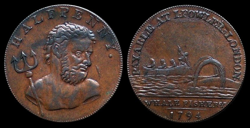 Middlesex, Fowler's, Whalefishery. Obverse - Nude bust of Neptune with part of a trident resting on his right shoulder. Legend: HALFPENNY. Reverse - A whaling boat with a crew of four, one of whom is about to hurl a harpoon at a whale spouting water to the right. Legend: PAYABLE AT I. FOWLERS LONDON, with WHALE FISHERY 1794 in the exergue. Edge:- Plain. Diesinker, Wyon; manufacturer, Mynd. Common. D & H 306