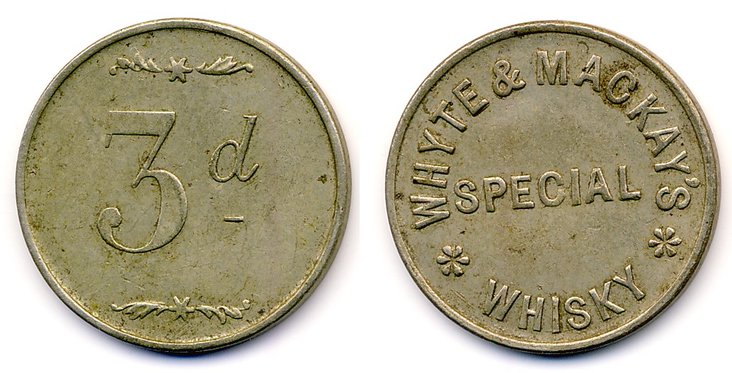 2. Beide Serien haben sowohl die Dollar-Nominale (1- bzw. 2-$) neben typisch britischen Wertangaben. So gibt es von den Wanderers auch Token zu 3 bzw. 6d, also Pence (H#642d und #642c). Von den Whisky-Token existieren neben den beiden Dollar-Werten auch solche zu 20/-, 10/- und 5/- (also Shillings). Außerdem ebenfalls kleine Nominale zu 3d und 6d. Bilder von letztern beiden hänge ich mal an (H#748g bzw. f)