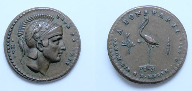 http://www.napoleonicmedals.org/coins/br-971.htmZu diesem Stück gibt es eine gute Beschreibung, die auf beide paßt, und die ich deshalb hier zitieren möchte.