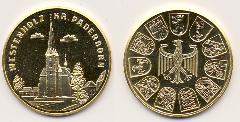 Liebe Freunde, wie schon hier viewtopic.php?f=22&t=4574 angedroht, folgt eine zweite Medaille aus Ostwestfalen. Dateianhang: Das Rv ist identisch zum Stück aus Löwen (der Bundesadler in der Mitte und die Wappen der alten Bundesländer drum herum). Wie viele Medaillen aus NRW hat der unbekannte Medailleur wohl auf diese Weise herausgegeben? Wir bewegen uns hier allerdings nicht im Altkreis Warburg, sondern im Kreis Paderborn. Und das Teil ist auch nicht aus Silber, sondern aus 986er Gold. Es wiegt 10,06 Gramm, hat einen glatten Rand und misst 26,0 mm im Durchmesser. Westenholz, das Bundesgolddorf 1985! Wer mehr über diese Nest, heute eingemeindet in die Stadt Delbrück (Westf.), wissen möchte kann hier nachlesen: http://de.wikipedia.org/wiki/Westenholz Zu einem Bundesgolddorf gehört auch eine Goldmedaille. Das hatten sich die Ortsvorsteher von Westenholz auch gedacht und prompt dieses Stück in Aufrag gegeben. Es zeigt die katholische neugotische Pfarrkirche St. Joseph. Die Grundsteinlegung erfolgte 1901 unter Verwendung des 1812 errichteten Kirchturms. 1905 war der Bau vollendet. Das ist das Wahrzeichen des Golddorfs Westenholz. Ich hoffe, der ein oder andere hatte ein klein wenig Vergnügen an diesem zugegebenermaßen sehr lokalem Exkurs. Unser hochgeschätzer klaupo hatte im Link der dritten Zeile jedenfalls für mich völlig überraschend angedeutet, ebenso wie ich gebürtiger Ostwestfale zu sein. Ich hatte ihn eher am Mittellauf der Ems im extremen Nordwesten von NRW vermutet. Aber die Ems entpringt ja im Kreis Paderborn. Es fügt sich also alles zusammen. Vielleicht kreisen wir klaupo ja sogar ein, und er teilt uns (oder zumindest mir per PN) mit, aus welchem Kaff in Ostwestfalen er stammt. Vielleicht kann er oder ich ja sogar irgend eine Münze oder Medaille dazu einbringen... Liebe Grüße Euer MG |
