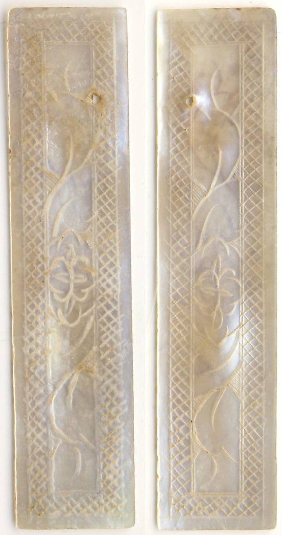 Wenn man aber erst einmal verschiedene Stücke aus verschiedenen Quellen vor sich hat, kann man beobachten, dass es größere Unterschiede in der handwerklichen Qualität, der künstlerischen Qualität und durchaus auch in der Dicke gibt: Je dicker, desto besser. Florale Ornamente und Blüten im Zentrum umrahmt von geometrischen Mustern sind die Regel, Darstellungen von ganzen Blumen oder mit Tieren sind seltener, szenische Darstellungen mit Menschen sind ziemlich selten. Ich zeige hier zunächst einen feiner gearbeiteten Spielstein mit Blumen, desen Perlmutt-Scheibe deutlich dicker ist, als die der drei zuvor gezeigten. Die Wörter "Blühen", "üppig", "Frühling" und "Gedeihen" tauchen in den Namen zig verschiedener Hongs als Symbole für Reichtum auf. Der zweite Spielstein ist in Form eines Karpfens, der ein buddhistisches und auch ein chinesisches Glückssymbol ist. Auf dem linken Bild sind in einem Doppelkreis zwei turtelnde Tauben eingraviert. Dieser Kreis sieht mir geradezu wie ein Firmenzeichen, ja ein Logo, eines Hongs aus, nennen wir ihn mal phantasievoll "Turteltauben bringen Dir Glück im Spiel". Wer mich jetzt endgültig für spinnert und abgedreht hält, möge sich einmal die # 1351 im Köhler-Osbahr-Katalog anschauen. Diese Beobachtungen verstärkten in mir den Verdacht, dass es eventuell doch Stücke gibt, die nicht von vornherein für den britischen Markt hergestellt wurden. Selbstverständlich ist auch eine Amulettfunktion solcher Stücke nicht auszuschließen.