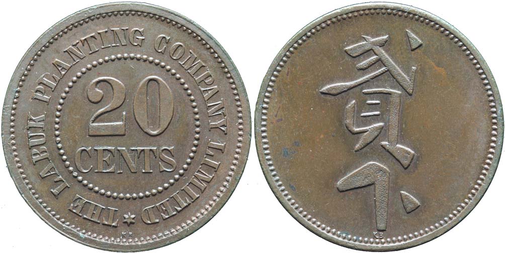 Auf Plantagengeld von British North Borneo findet mann den Buchstaben KB.