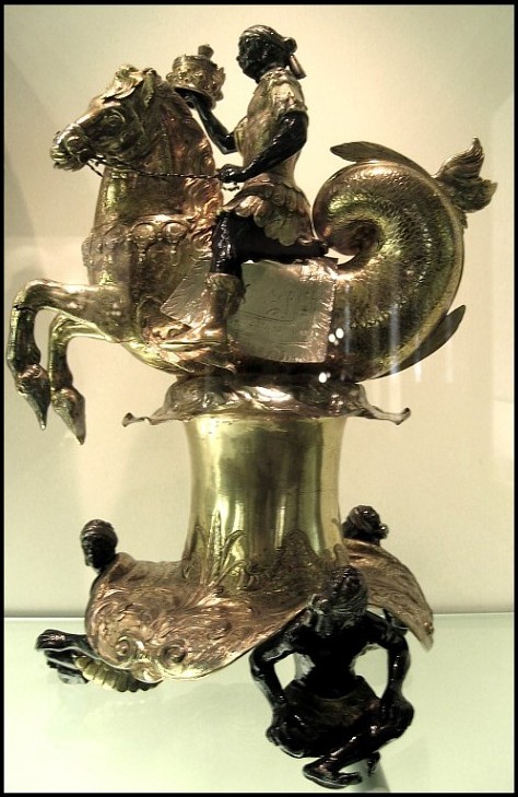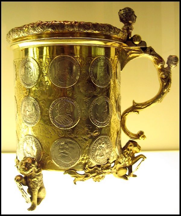 Roselius-Haus auf der Medaille ist mir noch etwas eingefallen. Ich habe es vor Jahren einmal besucht und von den Exponaten, die dort untergebracht sind, einige Aufnahmen gemacht. Um hier nicht mit sakraler Kunst zu langweilen, zeige ich einige dieser Exponate mit numismatischem Bezug - prächtige Pokale, Münzhumpen und -becher aus dem Bestand der