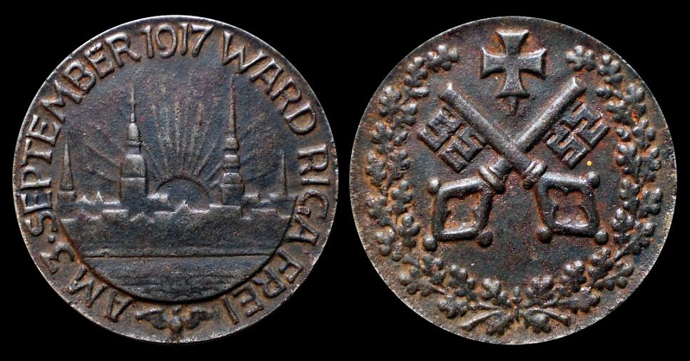 RIGA - DÖR" liest, was ich (vielleicht falsch) mit "Riga stirbt" übersetzen würde, wäre auch hier ein Zusammenhang erkennbar. Die Stadt wurde übrigens bereits im September desselben Jahres von den russischen Truppen wieder geräumt, wie die Medaille unten belegt. Sie zeigt auch den Kirchturm, der in der Mitte des Photos aufragt.