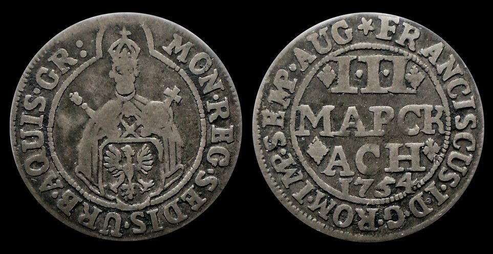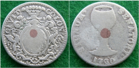 Av. Unter geziertem Helm mit Decke ovaler, fast kreisrunder Stadtschild von 8 ½ mm Höhe in wenig verzierter Einfas-sung. Die Kronen sind schlank und oben ausgebogen, die Teilung des Schildes wird durch zwei leicht nach unten ge-bogene Linien bewirkt. An den Seiten sind die gewöhnlichen Schildhalter, beide In der Richtung nach dem Schild blickend; sie stehen auf einem in der Mitte geraden, unten nach dem Rand hin ausgebogenen, an den Seiten nach oben geschweiften Gestellt. Vom Schildfuß her läuft unter dem Bogen des Fußgestells eine Verzierung aus zwei Ranken, die ungefähr wie ein A aussieht. Der Löwe ist doppeltgeschweift. Außen Kerbkreis; oben herum: CIVIT´ = COLON´ (kleine Buchstaben). Rv. Ein Rheinweinglas, sogen Römer mit hoher Säule, auf einem Fuß mit drei einfachen Zierreifen. Beim Übergang der Säule in den Kelch ist ein Kopf und beiderseits Zierat. Der Kelch selbst ist bauchig mir verengter Öffnung. Unten mit kleinen Ziffern bogig: 1730. Außen Kerbrand; rechts anfangend: SIGNUM´ = SENATORI´ Bem. Randschrift: BIBITE Zierat CUM Zierat LAETITA Zierat. In der Mitte ist ein Kupferstift von 2 mm eingelassen. Der doppelschwänzige Löse war um 1730 der übliche. Das SENATORI ist nicht etwa der Dativ, sondern die Abkürzung vom Senatorium. Katalog Noss 617 1728 gab es Schwierigkeiten wegen der Ratszeichen, von welchen, wie auch schon in früheren Jahren, viele Fälschungen gemacht und in den Verkehr gebracht wurden. Da sie, allerdings gegen ihrer Bestimmung, als Geld umliefen und wegen des Anspruchs auf Wein gern genommen wurden, ließ sich die vorhandene Menge schwer kontrollieren und Schäden für die Allgemeinheit nicht vermeiden. Deshalb wurde erwogen, die Ratszeichen so zu gestalten, daß sie sich von Geldstücken merklich unterscheiden. Eine solche Form fand sich in dicken gegossenen Schrötlingen mit einem durch die Mitte getriebenen Kupferstift darin. In dieser Gestalt war einer Verwechslung mit Geldmünzen vorgebeugt und die Fälschung erschwert. Es wurde die Prägung solcher Stücke beschlossen und deren Ausgabe in Aussicht genommen, sobald eine genügende Anzahl fertig gestellt sein würde. Hand in Hand damit sollte die Einziehung der alten Ratszeichen gehen. 1734 wurden dem Münzmeister 20 der alten Zeichen von 1716 zu 1 Taler angerechnet. Die Ratszeichen wurden bei jeder Ratssitzung deren gewöhnlich wöchentlich zwei stattfanden, den Bürgermeistern, den Sekretären, Syndiken und den anwesenden Ratsherren als Anweisung auf die eine gewisse Menge Wein aus dem Ratskeller gegeben. Für die nicht erschienenen Herren wurden jedesmal die Zeichen in die sogenannte Depositenkasse geworfen und am Schluß des Jahres verteilt. Auch bei außergewöhnlichen Gelegenheiten, z.B. bei einer Papstwahl, bei Jubiläen, beim Besuch vornehmer Personen, bei der Bekanntmachung eines Friedensschlusses, wurden Ratszeichen ausgeteilt. Der Probst von St. Martin erhielt als der vom römischen Stuhl bestellte Conservator privilegiorum jährlich zwölf Ratszeichen. Bei der großen Fronleichnahmsprozession gab es für den Weihbischof sechs, für den Domprediger vier, für jeden der vier Äbte vier, für jeden der sechs Dechanten vier, für den ältesten Domherrn vier, für die acht Cholare zusammen vier, für die Sänger und Organisten zusammen zwölf, für den Offermann zwei, für die Führer der Soldaten zwei, für die Bürgermeisterfrauen vier, für den Kaplan der Kirche Jerualem vier, für die Frau des Umlaufs, welche den Traghimmel verzierte, zwei, für jeden der vier Spielleute zwei und für jeden in der Prozession gehenden Ratsherrn eins. Die Teichen, gegen welche im Ratskeller jederzeit Wein geschenk werden mußte, hatten einen Silberwert von 7 Albus, galten aber im Verkehr als 39. Wann das hier beschriebene Zeremoniell aufgekommen ist, wird nicht gesagt, wohl dürfte es 1672 schon so oder ähnlich in Kraft gewesen sein. Die Bewertung mit 7 Albus kann für diese Zeit zutreffen, wenn man annimmt, daß die Zeichen aus feinem Silber bestehen. Der Verkehrswert von 39 Albus stammt aber aus dem letzten Teil des 18. Jahrhunderts. Auch zu außergewöhnlichen Ehrungen wurden die Ratszeichen verwandt. So erhielt 1687 der Münzmeister Newers als Belohnung für die erfolgreiche Reise nach Düsseldorf 12 Zeichen. Dann wurden bei besonderen Gelegenheiten an die Mitglieder des Rates diese Zeichen verteilt, als Regel jedesmal wenn die Neuprägung von solchen nötig wurde; dann empfing jeder Berechtigte 3 Stück. Ferner wenn z.B. das Portriat des jeweils regierenden Kaisers in der Ratsstube aufgehängt wurde. Diese Feier trug 1754 5 Stück ein. Am Ende der städtischen Selbständigkeit, als kein eigenes Geld mehr geprägt wurde, benutzte man die Ratszeichen gar zur Zahlung von Honoraren oder Gehalt. Bei der jährlichen Hebammenprüfung erhielt der Gewaltschreiber 1793: 42 und 1797: 54 Ratszeichen, der unterrichtende Professor der Medizin aber für das Jahr nur 40, 1796 wurden dem Stadtmusikus für ein Konzert 13 Zeichen gespendet und als 6 ½ Taler berechnet. Auch ein Buchbinder wurde so entlohnt. Derartige Ausgaben fanden nach dem 1. Juli 1897 nicht mehr statt.