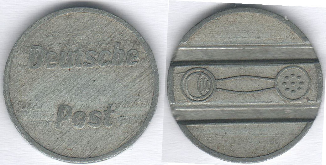 Völlig offen ist die Verwendung von Telefonmünzen in der DDR (russischen Zone). Ich hatte bisher die zweite Telefonmünze, die eindeutig aus Zink ist, dorthin gelegt, weil ich mir nicht vorstellen konnte, dass dort keine Telefonmünzen verwendet worden sind. Ein Nachweis fehlt allerdings bis jetzt. Die Bezeichnung "Deutsche Post" wurde in dieser Zeit bis zur Währungsreform 1948 und kurz danach in allen Besatzungszonen verwendet und ist daher kein Unterscheidungskriterium.