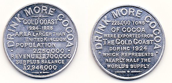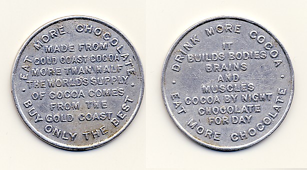 eine schöne Idee, das mit den Kakao-Marken von der Gold-Küste. Vice nennt sie ja in seinem Buch "Advertising Tickets" und vermutet, daß sie auf der "British Empire Exhibition" - 1924 in Wembley abgehalten - gratis an die Besucher verteilt wurden. Sicherlich nicht nur dort, denn es gibt solche Marken auch mit späterem Datum.