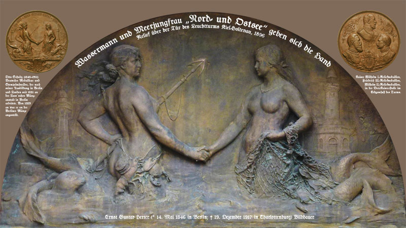 Auf dem beigefügten Bild sind das Original-Medaillon über der Leuchtturmtür von Herter dargestellt sowie Vorder- und Rückseite der Medaille, außerdem einige Informationen zu den Künstlern. Weiterhin ein Foto des Leuchtturms in Kiel-Holtenau aus heutiger Zeit.