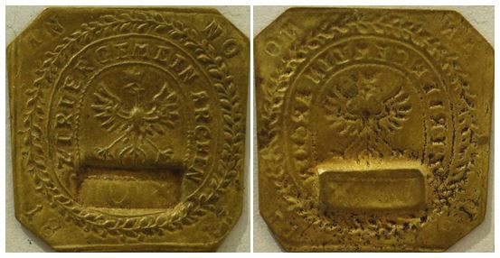 Messing; größte Breite, 26,6 mm; Höhe, 27 mm; Hohlprägung In den abgeschrägten Ecken: AN – NO / 18 – 17. Umschrift: ZIRLER GEMEIN ARCHEN / darunter Adler / Wertzahl 10 X (10 Kreuzer). Marken mit Werten: 10, 15, 20, 30 und 50 Kreuzer sowie 1,2,3 Gulden sind bekannt.