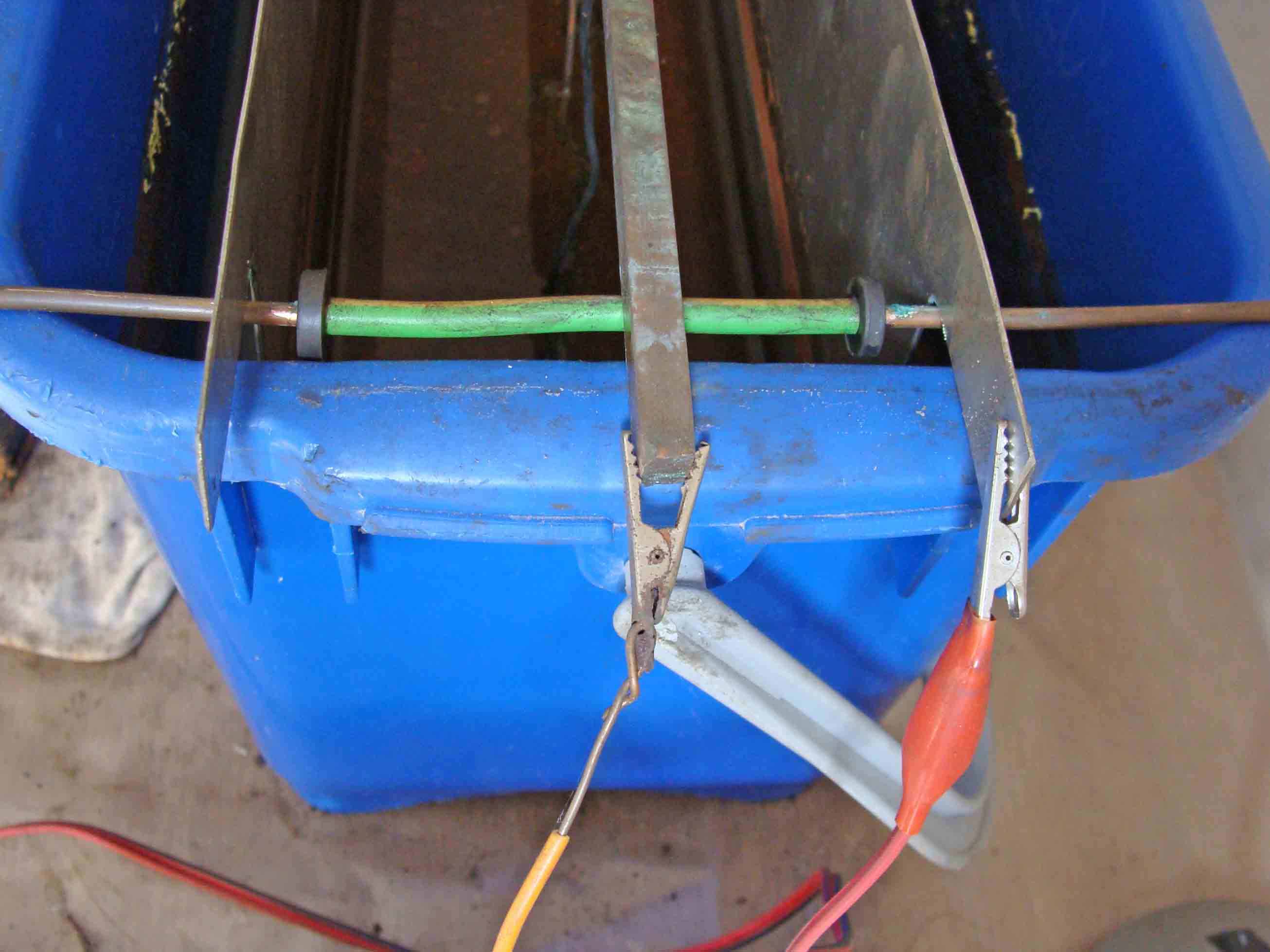 Drei Fotos sind besser, als eine Skizze. Das Gefäß ist ein massiver Aufwaschkübel von einen Wischmop. Das passen auch Dolche, Lanzenspitzen und größere Sachen bis Halbmetergröße hinein. Die Leiterplatten sind aus Nierosterstahl und an den Pluspol angeschlossen. Die zweite Platte bekommt den Strom über einen 5mm Kupferdraht. Der ist aber dazwischen Isoliert, weil der Einhängestab (- Pol) auch darauf liegt. Somit können die Platten verschoben werden, je nachdem ob man schmale oder breitere Gegenstände behandelt. Ein Kupfervierkantstab ist an den Minuspol angeschlossen und darauf werden die Sachen in das destillierte Wasser (mit einigen Löffeln Kristallsoda leitfähig gemacht) hineingehängt. Der Rest ist Erfahrungssache.