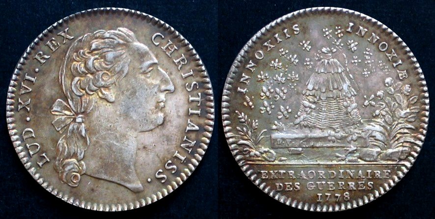 Rv. Bienenkorb gesäumt von Blumen und umschwärmt von Bienen. Signatur D.V. INNOXIIS. INNOXIAE („Den Arglosen fügen sie keinen Schaden zu“). Exergue: EXTRAORDINAIRE. DES. GUERRES. 1778. („Kriegsministerium“, i.e. Hrsg. des Jetons). Feuardent 904