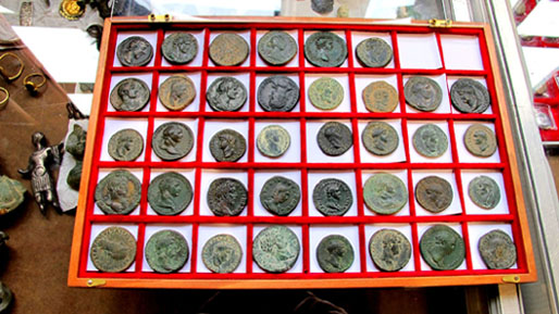 Photo 2 ----- > Römische Großbronzen am Stand eines englischen Münzhändlers.