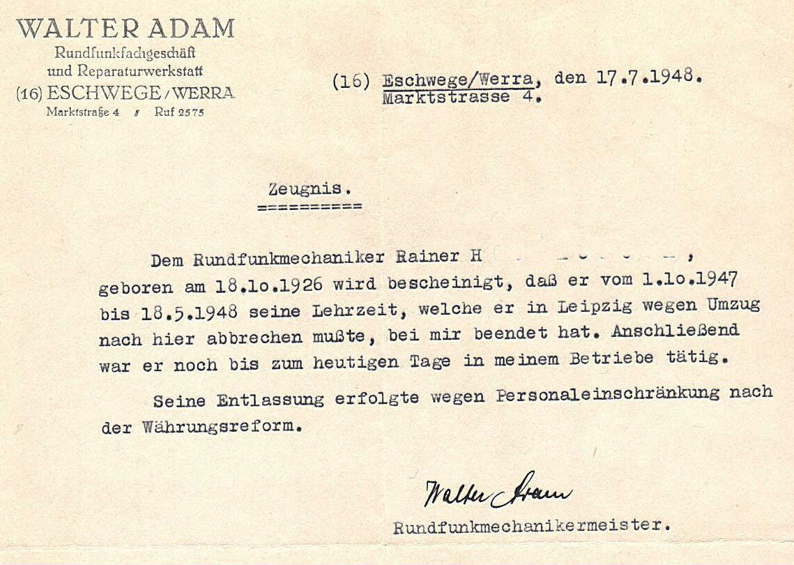 Ein spannendes Zeugnis, und es zeigt glaube ich ganz gut, dass wichtige Dinge wie Währungsumstellungen etc. nur aus einer gewissen (zeitlichen) Distanz heraus wirklich zu würdigen sind. Der Arbeitgeber wird damals die Währungsreform, so hört es sich zumindest an, auch skeptisch betrachtet haben, weil er wegen der D-Mark Leute entlassen musste (war es wirklich deswegen oder vielmehr wegen schlechter Auftragslage - warum auch immer?).